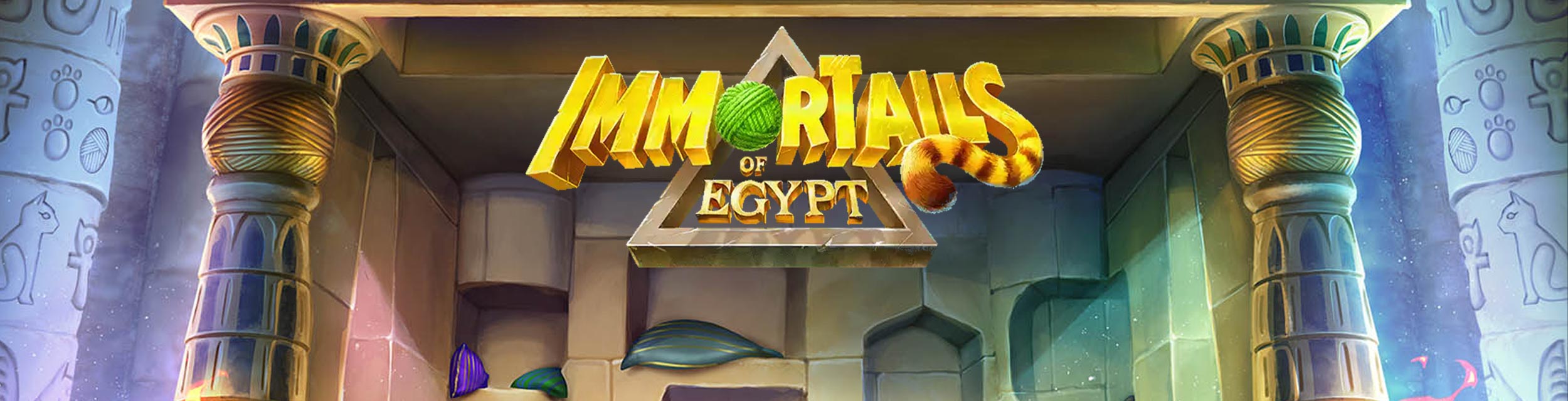 Immortails of Egypt speelt zich af in een grootse, maar uiterst fascinerende omgeving. Aan de zijkanten van de rollen staan twee pilaren met onderaan brandende fakkels, en daarnaast weer grotere pilaren met ornamenten. Tussen de pilaren boven de rollen kun je een glimp opvangen van delen van een nachtelijke hemel. Het dak van de rollen is voorzien van een display met hangsloten en een kattenpoot, die de vermenigvuldigers in de gratis spins weer bijhoudt. Er zijn ook afbeeldingen van de drie katten met markeringen die ze kunnen upgraden naar wilds. Om te winnen, moet je 3 dezelfde symbolen landen die verticaal of diagonaal met elkaar zijn verbonden. Winsten beginnen bij de eerste rol aan de linkerkant.